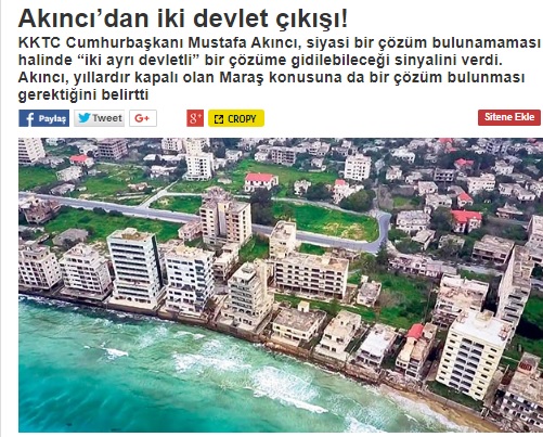 Με λύση δύο κρατών εξακολουθεί να εκβιάζει ο Μουσταφά Ακιντζί, ο οποίος με νέα συνέντευξη του στην Μιλλιέτ έθεσε και θέμα χωριστής ένταξης του ψευδοκράτους στην ΕΕ. Την ίδια στιγμή ωστόσο φρόντισε να κλείσει με συνοπτικές διαδικασίες το ζήτημα της επιστροφής της Αμμοχώστου, που ο ίδιος άνοιξε.