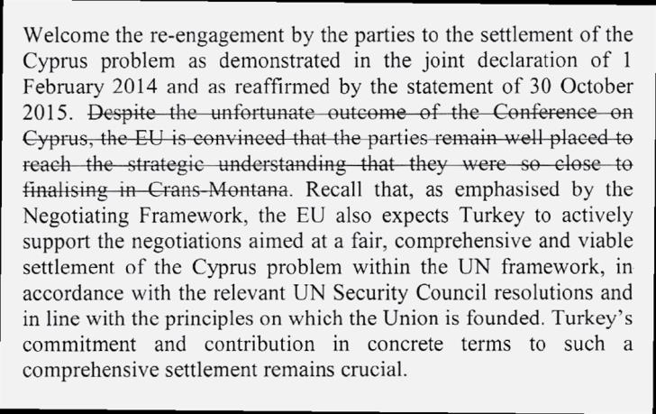 Οι αναφορές του εν λόγω εγγράφου, όπως τελικά εγκρίθηκε, καλύπτουν πλήρως τις θέσεις της Λευκωσίας έναντι της Άγκυρας στο πεδίο των κυπρογενών υποχρεώσεων (βλέπε άλλη στήλη), αλλά και στο Κυπριακό (μετά τη διαγραφή των επίμαχων αναφορών). Το κείμενο «καλωσορίζει την εκ νέου δέσμευση των μερών για τη διευθέτηση του κυπριακού προβλήματος, ως επιδείχθηκε στη κοινή διακήρυξη της 1ης Φεβρουαρίου 2014 και όπως επαναβεβαιώθηκε στη δήλωση της 30ής Οκτωβρίου 2015». Επαναλαμβάνει ότι «όπως τονίζεται στο Διαπραγματευτικό Πλαίσιο, η Ε.Ε. αναμένει επίσης την Τουρκία να συμβάλει ενεργώς στις διαπραγματεύσεις που στοχεύουν σε μια δίκαιη, συνολική και βιώσιμη λύση στο κυπριακό πρόβλημα, στο πλαίσιο του ΟΗΕ, σύμφωνα με τα σχετικά ψηφίσματα του Συμβουλίου Ασφαλείας του ΟΗΕ και σύμφωνα με τις αρχές επί των οποίων εδράζεται η Ε.Ε.». Επαναδιατυπώνει την επίσης κλασική θέση της Ε.Ε. ότι «η δέσμευση της Τουρκίας και η συμβολή της με συγκεκριμένους τρόπους σε μια τέτοια συνολική διευθέτηση παραμένει κρίσιμη».