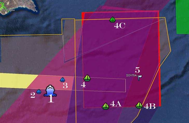 Στον χάρτη, με αρ. 1 η θέση που βρίσκεται το Saipem 12.000 και με αριθμούς 2 και 3 τα σκάφη υποστήριξης Vos Prime και Vos Prudence. Με αριθμούς 4 και 4 Α, 4Β,4C οι θέσεις των πλησιέστερων τουρκικών πολεμικών πλοίων. Βορειότερα σύμφωνα με πληροφορίες βρίσκεται και τουρκικό υποβρύχιο.