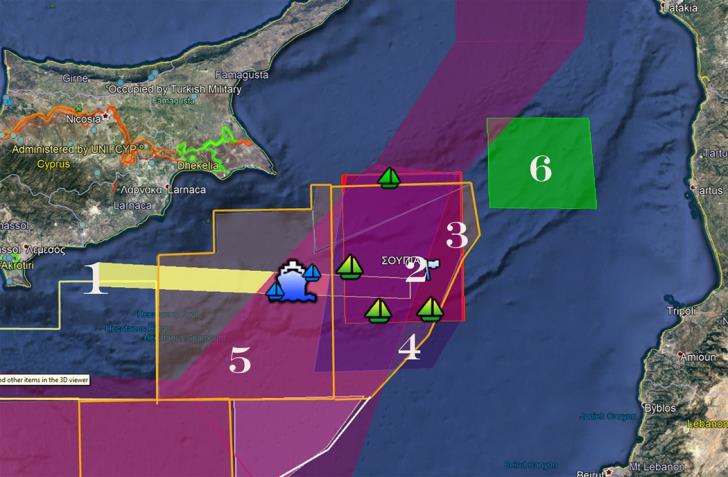 Με αρ. 4, οι θέσεις των πλησιέστερων προς το γεωτρύπανο τουρκικών πολεμικών πλοίων εντός του τεμαχίου 3.