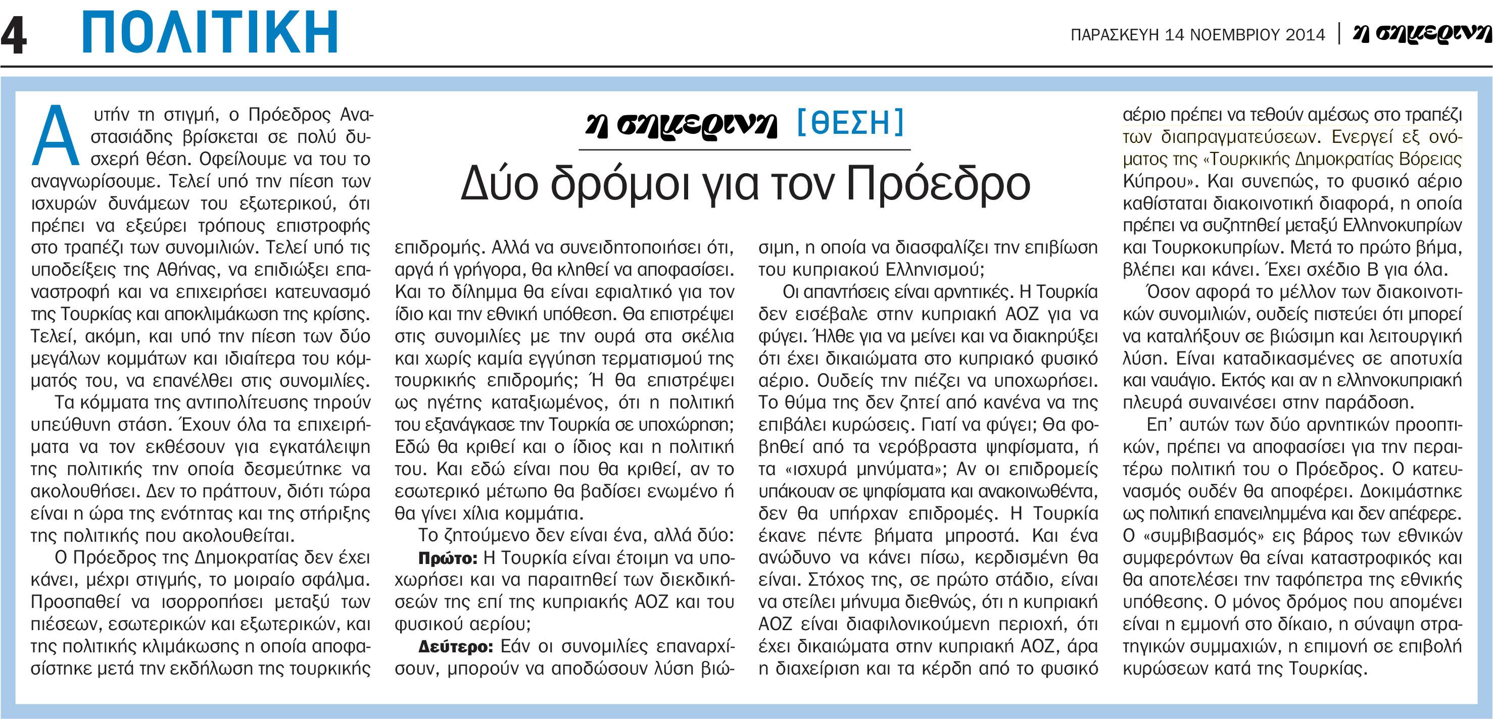ΑΣΦΑΛΕΙΑ-ΑΜΥΝΑ / ΚΥΠΡΙΑΚΟ / ΤΟΥΡΚΙΚΗ ΑΠΕΙΛΗΔΥΟ ΔΡΟΜΟΙ ΓΙΑ ΤΟΝ ΠΡΟΕΔΡΟ 19 Φεβρουαρίου 201820 Φεβρουαρίου 2018 - από τον/την Ονήσιλος 19.2.2018 Ένα ιδιαίτερα επίκαιρο άρθρο το οποίο δημοσιεύθηκε προ 4ετίας. Άλλαξε κάτι; Παρατίθεται αυτούσιο το υπόψη άρθρο όπως αυτό δημοσιεύθηκε στην εφημερίδα ΣΗΜΕΡΙΝΗ.