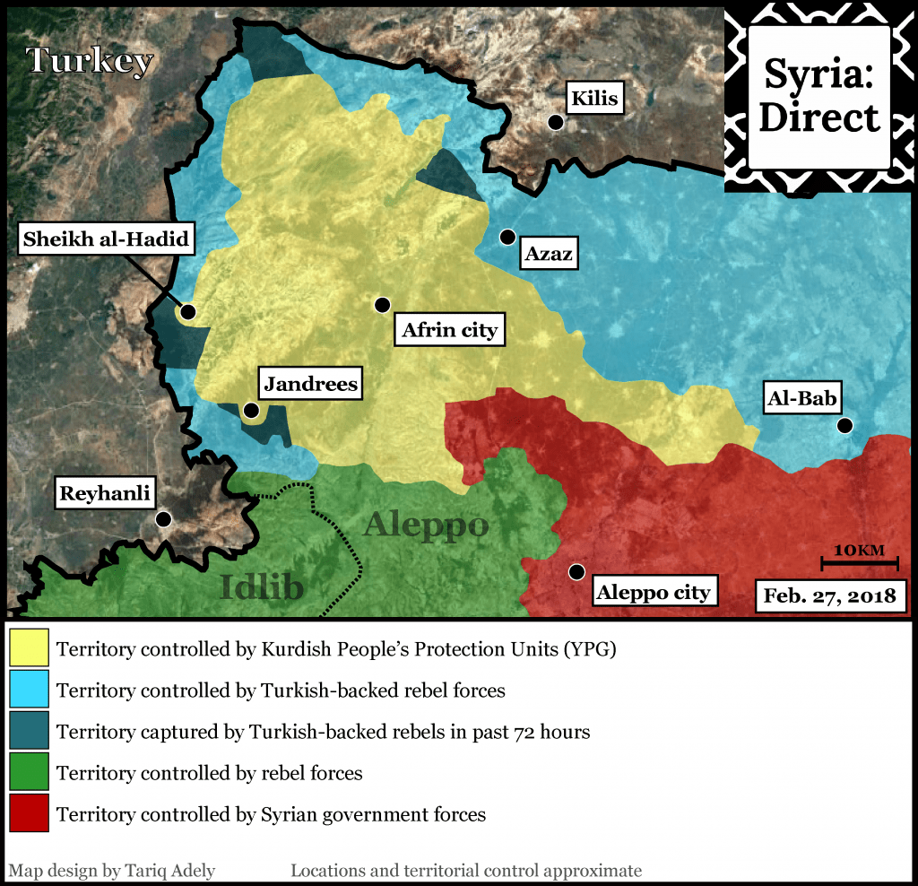 Στις 20 Ιανουαρίου 2018, η Τουρκία ξεκίνησε την Επιχείρηση “Κλάδος Ελαίας” στη βόρεια Συρία και, συγκεκριμένα, στην Afrin. Αναφορικά με την τελευταία, πρόκειται για μια συριακή πόλη που βρίσκεται πολύ κοντά στα σύνορα της Τουρκίας, καθώς απέχει μόλις 28 χιλιόμετρα από τον τουρκικό συνοριακό σταθμό Öncüpınar, ο οποίος αποτελεί και είσοδο στη Συρία. Η πόλη κατοικείται από σχεδόν 49.000 κατοίκους, το 74% των οποίων είναι Κούρδοι και το 25% Άραβες. Σε συντριπτικό ποσοστό (σχεδόν 90%) οι κάτοικοι της Afrin είναι Σουνίτες Μουσουλμάνοι. Η πόλη βρίσκεται υπό τον έλεγχο των “Μονάδων Προστασίας του Λαού” (Αγγλικά: People’s Protection Units, Κουρδικά: Yekîneyên Parastina Gel – YPG), μιας κουρδικής κυρίως πολιτοφυλακής που δραστηριοποιείται στη Συρία, και αποτελεί την κύρια συνιστώσα των “Συριακών Δημοκρατικών Δυνάμεων” (Αγγλικά: Syrian Democratic Forces – SDF), της “Δημοκρατικής Ομοσπονδίας της Βορείου Συρίας” (Αγγλικά: Democratic Federation of Northern Syria – DFNS) (DRK Insight, 2017).
