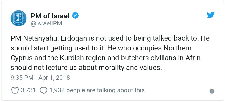 «Ο Ερντογάν δεν έχει συνηθίσει να του αντιμιλούν. Πρέπει ν’ αρχίσει να το συνηθίζει. Αυτός που κατέχει τη Βόρεια Κύπρο και την κουρδική ζώνη και σφαγιάζει αμάχους στο Αφρίν, δεν μπορεί να μας κάνει κήρυγμα για αξίες και ηθική», αναφέρει συγκεκριμένα ο Νετανιάχου σε ανάρτησή του στο twitter.