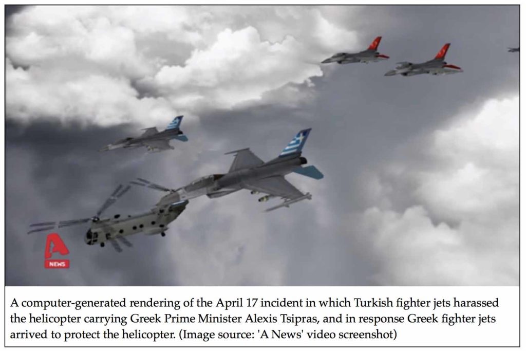 Turkey has been harassing Greece consistently. Most recently, this week, on April 17, two Turkish fighter aircraft harassed the helicopter carrying Greek Prime Minister Alexis Tsipras and the Greek Armed Forces Chief Admiral Evangelos Apostolakis as they were flying from the islet of Ro to Rhodes.