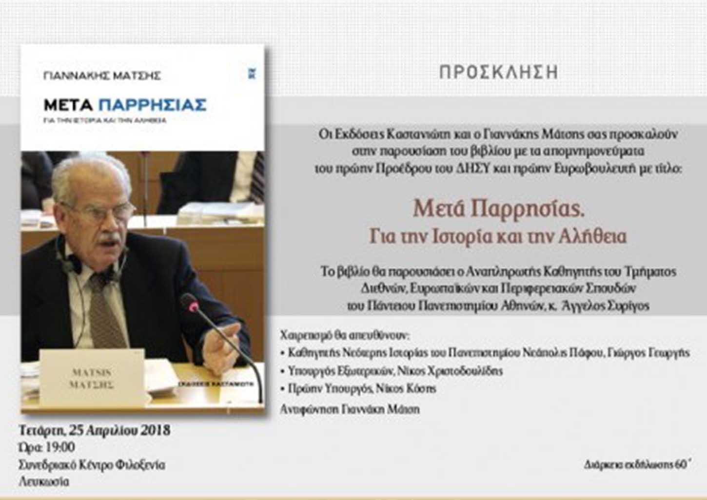 Όταν αξιολογείς ένα βιβλίο πολιτικού, μιας ιστορικής προσωπικότητας, όπως ο Γιαννάκης Μάτσης, είσαι υποχρεωμένος να είσαι αυστηρός. Για να μην αδικήσεις τον ίδιο και για να μην τον αδικήσει η ιστορία. Διάβασα με προσοχή το βιβλίο του Γιαννάκη Μάτση, την αυτοβιογραφία του, που φέρει τον τίτλο: «Μετά Παρρησίας. Για την Ιστορία και την Αλήθεια». Και το πρώτο ερώτημα που εγείρεται είναι, εάν όντως, ο τίτλος ανταποκρίνεται στο περιεχόμενο του βιβλίου. Η απάντηση είναι θετική. Ναι, ό,τι αναφέρει ο συγγραφέας το γράφει με παρρησία, χωρίς να διστάζει να αποκαλύψει πτυχές, όπως ο ίδιος τις έζησε, με ισχυρές πολιτικές προσωπικότητες του τόπου, που άλλοι ενδεχομένως, επειδή ακριβώς δεν είναι ευχάριστες, να μην τολμούσαν ποτέ να τις φέρουν στο φως.