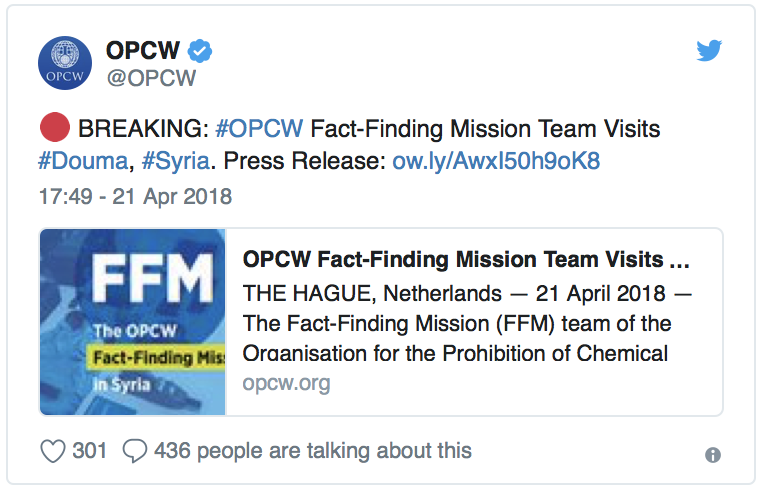 The Organization for the Prohibition of Chemical Weapons (OPCW) visited two sites in Douma on April 21 and 25 collecting samples there. The results haven’t been provided yet.
