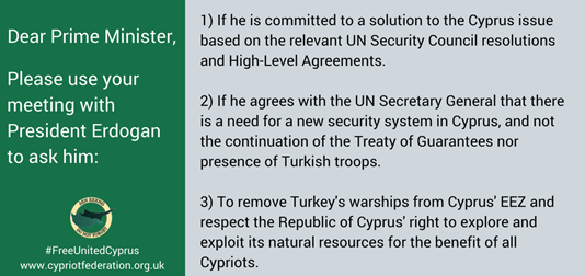 The National Federation of Cypriots in the UK has called on the Prime Minister, Mrs Theresa May, to raise three crucial concerns with President Erdogan of Turkey on behalf of UK Cypriots.