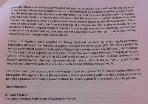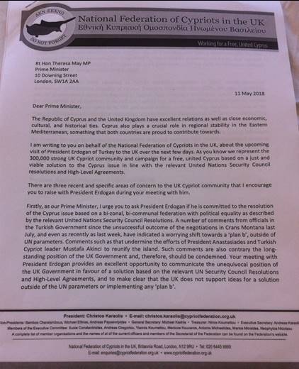 The Federation President, Christos Karaolis, also wrote a letter to Mrs May ahead of her meeting with the President of Turkey in London on Tuesday 15 May.