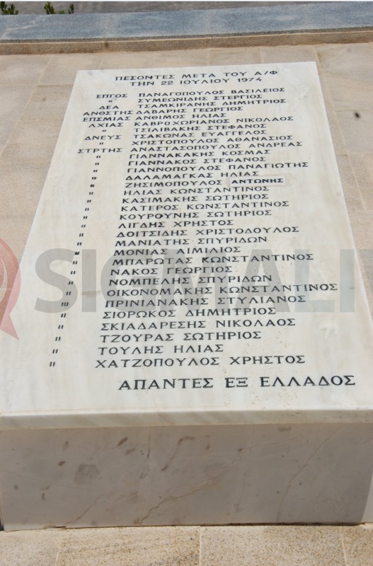 – Για να τοποθετηθεί Μνημειακά στον Τύμβο της Μακεδονίτισσας όπου κατέπεσε, καταρριφθέν από φίλια πυρά, το Νοράτλας 53-133 «ΝΙΚΗ-4» πριν τα ξημερώματα της Δευτέρας 22 Ιουλίου 1974. Εκεί δίπλα στην πρώτη μαρμάρινη πλάκα του Τύμβου, με τα ονόματα των εκεί, εν ώρα μάχης, πάραυτα ενταφιασθέντων, τεσσάρων αεροπόρων και 29 λοκατζήδων απ’ τη μητέρα Ελλάδα.