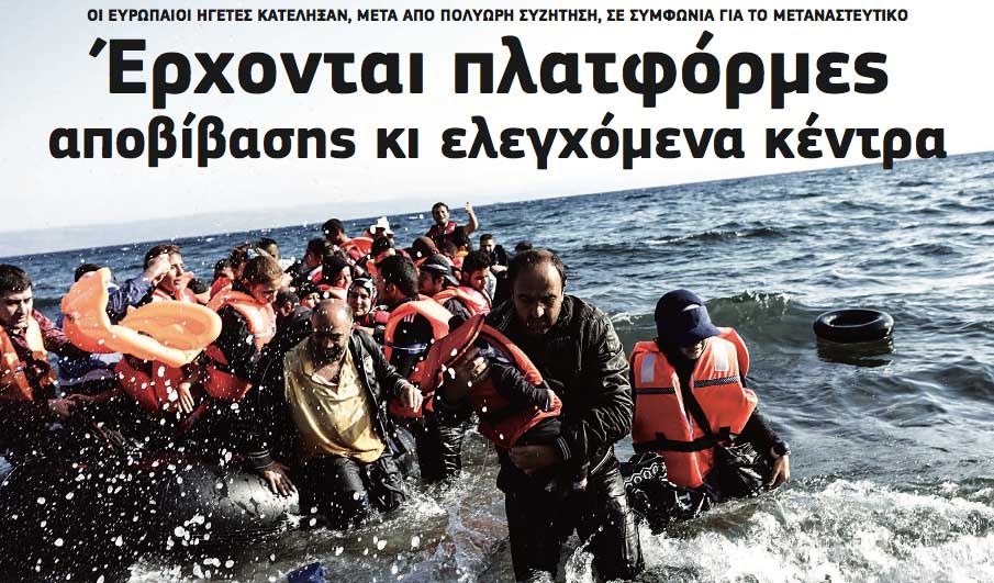 5. Για να τρωθεί το «επιχειρηματικό μοντέλο των διακινητών» μεταναστών και προσφύγων και άρα να «αποτρέπονται οι τραγικές απώλειες ζωών», είναι «απαραίτητο να εξαλειφθούν τα κίνητρα για τα επικίνδυνα αυτά ταξίδια. Αυτό απαιτεί μια νέα προσέγγιση», που θα βασίζεται σε «κοινές ή συμπληρωματικές ενέργειες των χωρών μελών» ως προς την αποβίβαση «όσων σώζονται σε αποστολές έρευνας και διάσωσης». «Σε αυτό το πλαίσιο, το Ευρωπαϊκό Συμβούλιο καλεί (…) να εξεταστεί η ιδέα να δημιουργηθούν περιφερειακές πλατφόρμες αποβίβασης, σε στενή συνεργασία με τρίτες χώρες, την Ύπατη Αρμοστεία του ΟΗΕ για τους Πρόσφυγες (UNHCR) και τον Διεθνή Οργανισμό Μετανάστευσης (ΔΟΜ). Αυτές οι πλατφόρμες θα πρέπει να λειτουργούν λαμβάνοντας υπόψη τις ιδιαίτερες περιστάσεις, με πλήρη σεβασμό του διεθνούς δικαίου».