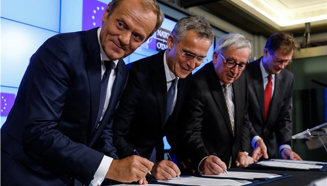 Πέραν όμως από την αναφορά στην παράγραφο 3 της κοινής διακήρυξης υπήρξε μια πιο ξεκάθαρη τοποθέτηση από πλευράς του Προέδρου του Συμβουλίου της ΕΕ Ντόναλντ Τουσκ. «Στόχος μας είναι να προστατέψουμε τους Ευρωπαίους πολίτες με όλα τα δυνατά και διαθέσιμα μέσα και γι’ αυτό το σκοπό δεν υπάρχει καλύτερος εταίρος από το ΝΑΤΟ» ανέφερε ο κ. Τουσκ. Όπως είπε, η συνεργασία ΕΕ – ΝΑΤΟ θα ενισχυθεί σε σημαντικούς τομείς, όπως η βελτίωση της στρατιωτικής κινητικότητας, η αντιμετώπιση κυβερνητικών και υβριδικών επιθέσεων, η καταπολέμηση της τρομοκρατίας και η καταπολέμηση των διακινητών μεταναστών στη Μεσόγειο.