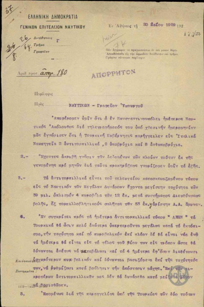 Σύμφωνα με αναφορά του Γ. Πανά, αρχηγού του Γενικού Επιτελείου Ναυτικού, προς το υπουργείο Ναυτικών, τον Μάιο του 1929, γινόταν λόγος ότι η Άγκυρα είχε παραγγείλει στα ιταλικά ναυπηγεία αντιτορπιλικά, υποβρύχια και ανθυποβρύχια, κάτι που θα δημιουργούσε τεράστια ναυτική ανισορροπία μεταξύ των δυο κρατών.