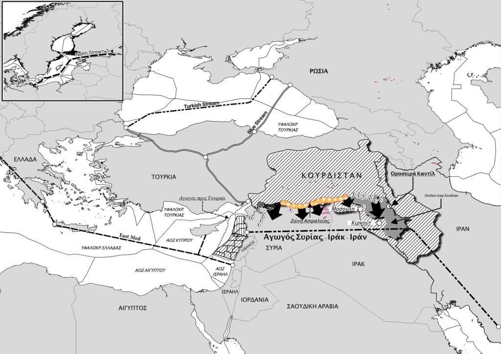 1. Θέλει να στήσει το δικό της ενεργειακό παιχνίδι στη Μεσόγειο, μαζί με το Ιράν και τα πιθανά αποθέματα φυσικού αερίου στη θαλάσσια περιοχή της Συρίας, τα οποία έχει ήδη καπαρώσει. Θέλει τη δημιουργία αγωγού από το Ιράν προς τη Συρία και από εκεί προς διάφορες κατευθύνσεις. Ο έλεγχος των θαλάσσιων και άλλων οδών του πετρελαίου είναι ένας από τους βασικούς λόγους εμπλοκής της στον πόλεμο της Συρίας και το φλερτ της με την Τουρκία, η οποία θέλει να προωθηθεί πέραν του όρους Καντίλ, για να φτάσει, από τη μια, ώς τις ενεργειακές πηγές της Μοσούλης, και, από την άλλη, να έχει τη δυνατότητα να προωθήσει δυνάμεις νότια. Η χερσαία προέκταση προς νότο σχετίζεται με τον έλεγχο της θαλάσσιας περιοχής Κύπρου και Συρίας και ευρύτερα.