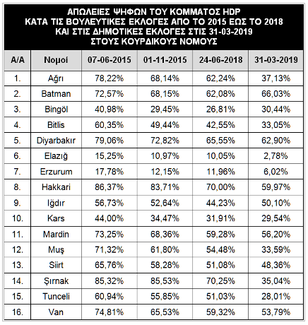 Από την άλλη πλευρά, αυτό που προκαλεί έντονο προβληματισμό είναι η απώλεια ψήφων του κουρδικού κόμματος HDP στους νομούς της ανατολικής και νοτιοανατολικής Τουρκίας, η οποία προφανώς θα τύχει εκμετάλλευσης από την τουρκική διπλωματία προσδίδοντας σε αυτό, ακόμη και, γεωπολιτική διάσταση αναφορικά με τις εξελίξεις στη Συρία και το Βόρειο Ιράκ. Για καλύτερη αντίληψη των εν λόγω εκλογικών αποτελεσμάτων και τη συνεχή απώλεια κουρδικών ψήφων μετά το 2015 παρατίθεται ο ακόλουθος πίνακας.