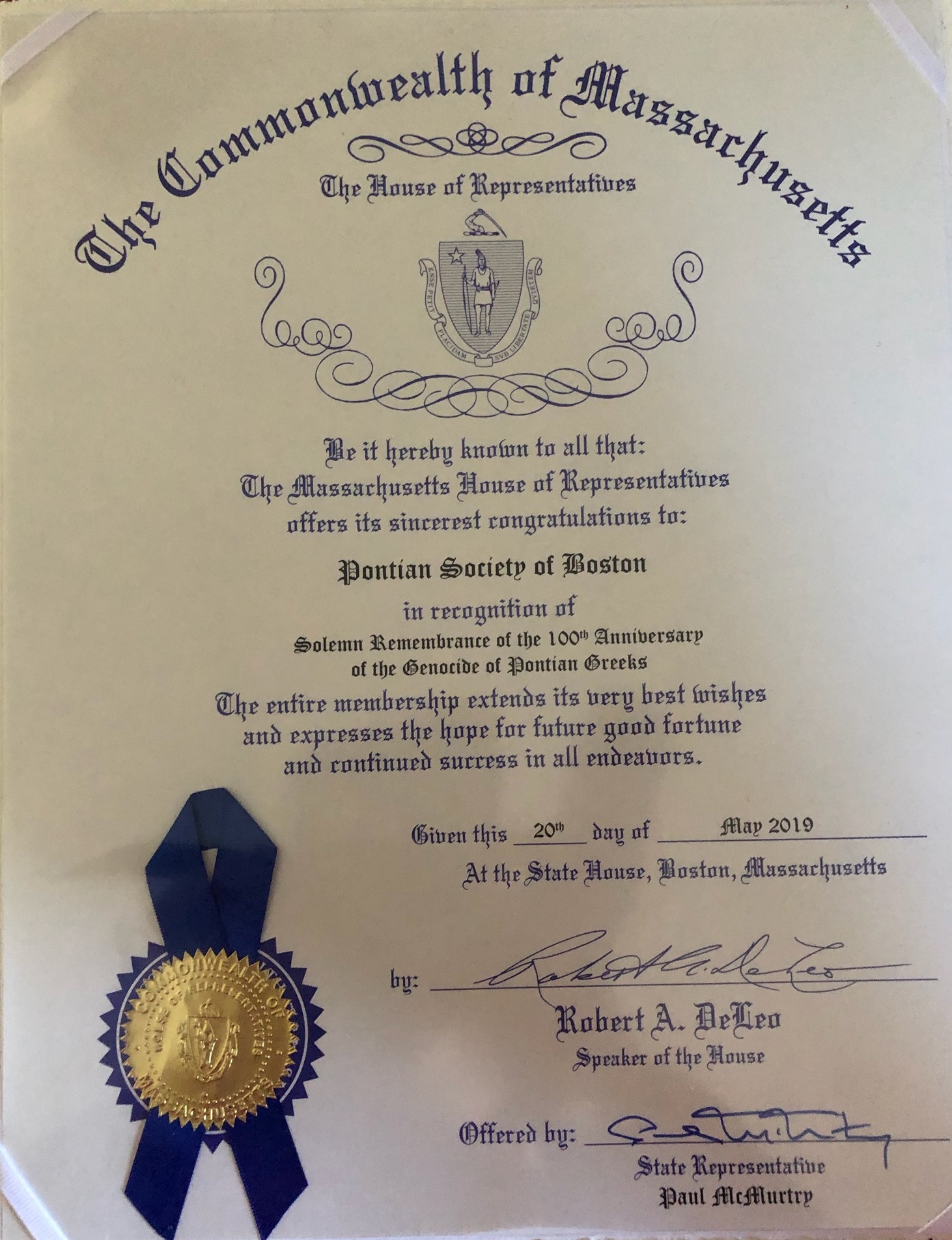 Στις 20 Μαΐου 2019, έλαχε χώρα στην αίθουσα συνεδριάσεων 437, του Κυβερνείου της Μασαχουσέτης ένα Ιστορικό Συμπόσιο που διοργάνωσε ο Σύλλογος Παναγία Σουμελά Βοστώνης, για την συμπλήρωση 100 χρόνων από την Ποντιακή Γενοκτονία.