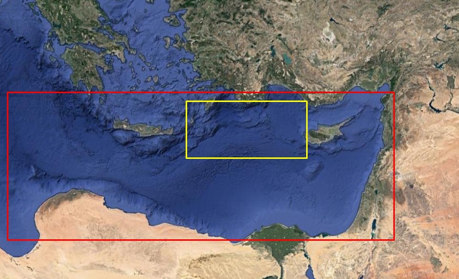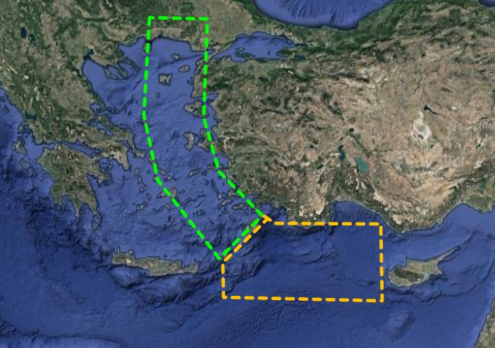 Η περιοχή όμως της Ανατολικής Μεσογείου όπου αναμένεται να υπάρξουν αψιμαχίες σε μια μελλοντική αντιπαράθεση Ελλάδας-Τουρκίας, είναι μόνο ένα μικρό τμήμα της ευρύτερης Ανατολικής Μεσογείου, έκτασης 75.000 τ.χλμ. Η περιοχή συνεπώς της Ανατολικής Μεσογείου που αναφερόμαστε, έχει σαν σύνορα τις εξής χερσαίες περιοχές (από δυτικά προς ανατολικά)