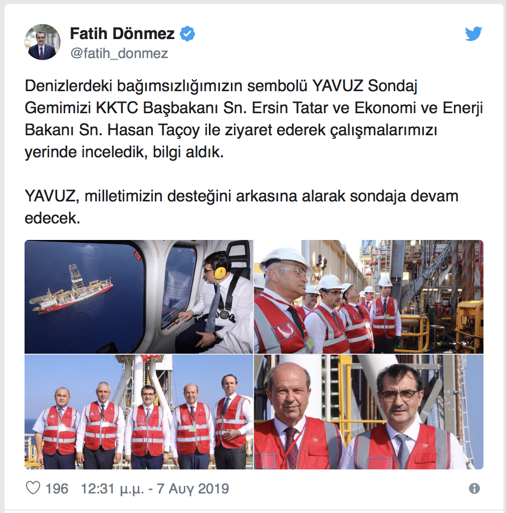 Ο Τούρκος Υπουργός είπε ότι θέλει να υπάρξει σύντομα αποτέλεσμα στις εργασίες γεώτρησης που γίνονται σε όλο το νησί και ευχαρίστησε τον Τούρκο Πρόεδρο Ταγίπ Εντογάν για τη στήριξη που προσφέρει για το θέμα, λέγοντας ότι οι γεωτρήσεις είναι εθνική υπόθεση. “Πρώτα ο Αλλάχ σύντομα θα δώσουμε τα καλά νέα. Ασφαλώς αυτή η αναζήτηση είναι μια ριψοκίνδυνη υπόθεση.