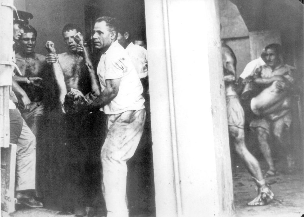 Κρατάμε ιστορικές φωτογραφίες στα χέρια μας που καταδεικνύουν το μέγεθος της φρίκης. Στη μια βλέπουμε να μεταφέρουν έναν τραυματία. Μπορείτε να μας πείτε περισσότερα για αυτή την εικόνα;