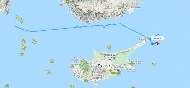 Ο δεύτερος χάρτης δείχνει την πορεία του τουρκικού μη επανδρωμένου αεροσκάφους στην Κύπρο. Από τα τουρκικά παράλια κατευθύνεται στη χερσόνησο της Καρπασίας.