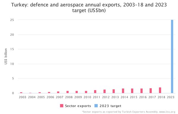 1. Αύξηση των εσόδων από τις πωλήσεις μέσω της τουρκικής πολεμικής βιομηχανίας της τάξης των 25 δισ. δολαρίων έως το 2023, οπότε και επιθυμεί να γιορτάσει τα 100 χρόνια από τη σύγχρονη τουρκική Δημοκρατία. Το 2018 τα έσοδα από την τουρκική πολεμική βιομηχανία ήταν 2 δισ. δολάρια και παρουσίασαν αύξηση της τάξης του 17% συγκριτικά με τα προηγούμενα χρόνια.
