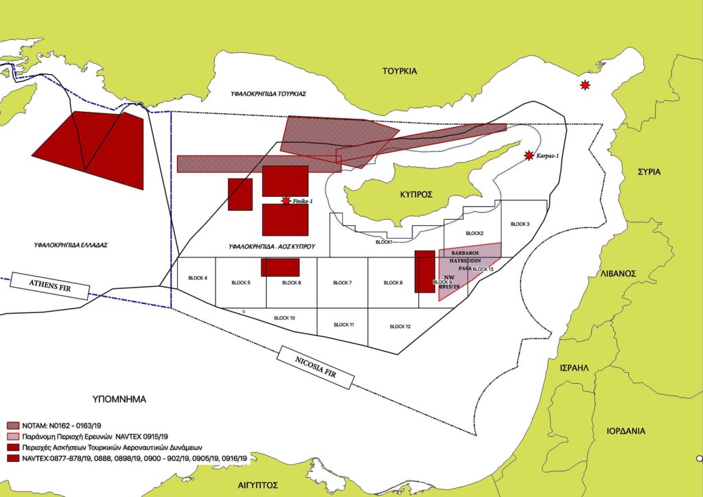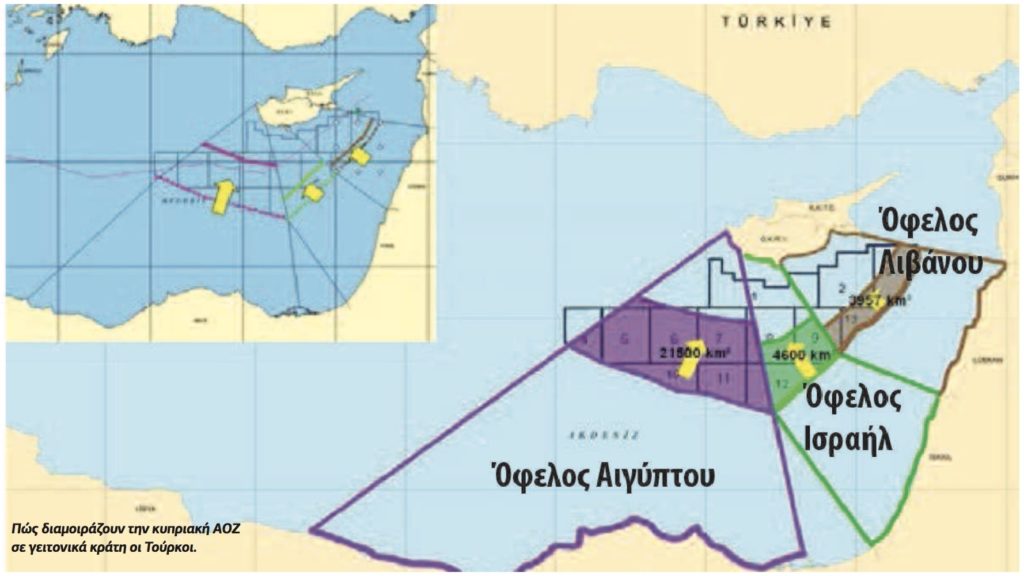 Όσο, δε, για τους Τούρκους, είναι έτοιμοι, με βάση τους δικούς τους χάρτες, να δώσουν τμήμα της κυπριακής ΑΟΖ στο Ισραήλ και στην Αίγυπτο, καθώς και στον Λίβανο, όταν θα γίνει η ανακατανομή της, μετά τη λύση, όπως η Άγκυρα αξιώνει. Υπάρχουν σχετικοί χάρτες που έχουν ετοιμαστεί από την Τουρκία με τη συμμετοχή των ενόπλων δυνάμεων, νομικών και διπλωματών του βαθέος κράτους (βλέπε χάρτη). Εάν το Ισραήλ και η Αίγυπτος θα τσιμπήσουν ή όχι, είναι θέμα που θα δείξει ο χρόνος και θα καθοριστεί από τα συμφέροντα. Εάν δεν τσιμπήσουν και αν λυθεί όπως σχεδιάζει η Τουρκία το Κυπριακό, η Κύπρος δεν θα είναι σημείο αναφοράς για ασφάλεια και ανάπτυξη, όπως θα συμβεί με τον EastMed και την εποπτεία των ΗΠΑ, αλλά περιοχή τριβής μεταξύ Ισραήλ, Τουρκίας και Αιγύπτου. Κυρίως μεταξύ Ισραήλ – Τουρκίας. Ούτως ή άλλως, εμείς δεν θα είμαστε κράτος, αλλά προτεκτοράτο της Τουρκίας…