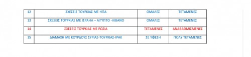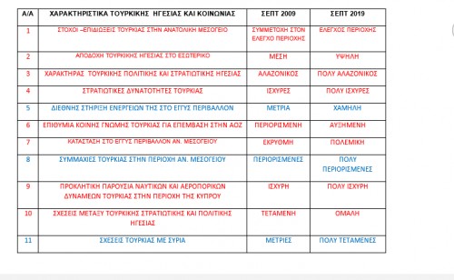 Στον παραπάνω πίνακα τα αδύνατα χαρακτηριστικά της Τουρκίας φαίνονται με μπλε χρώμα ενώ με κόκκινο τα επικίνδυνα χαρακτηριστικά για την περιοχή και τον Ελληνισμό. Ως εκ τούτου, η προσπάθεια του Ελληνισμού σε Κύπρο – Ελλάδα και Διασπορά θα πρέπει να επικεντρωθεί και να αξιοποιήσει τις αδυναμίες (μπλε χρώμα). Όλα τα υπόλοιπα χαρακτηριστικά στοιχεία προκαλούν έντονο προβληματισμό και κλίμα ανασφάλειας για τον Ελληνισμό και θα πρέπει να είμαστε έτοιμοι να αντιμετωπίσουμε, με όλα τα διπλωματικά, νομικά και οικονομικά μέσα, την τουρκική προκλητικότητα και παράλληλα να είμαστε έτοιμοι αμυντικά για οποιαδήποτε επιθετική στρατιωτική ενέργεια .