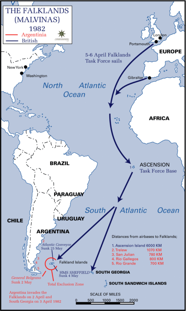 Στις 2 Απριλίου του 1982, η Αργεντινή και η Μεγάλη Βρετανία συγκρούστηκαν ένοπλα για την κυριαρχία των νησιών Φώκλαντ ή Μαλβίνας, κατά τους Αργεντινούς. Τα Φώκλαντ είναι ένα νησιωτικό σύμπλεγμα με δύο μεγάλα νησιά (Ανατολικό και Δυτικό Φώκλαντ) και περισσότερα από 200 μικρότερα, που βρίσκονται 450 χλμ. περίπου ανατολικά της Γης του Πυρός, στο νοτιότερο άκρο της αμερικανικής ηπείρου. Το ζήτημα του καθεστώτος των νησιών βρίσκεται στο προσκήνιο από το 1830, όταν οι Βρετανοί κατέλαβαν τα νησιά. Έκτοτε, η Αργεντινή, ανεξάρτητο κράτος από το 1816, επεδίωκε την προσάρτησή τους.