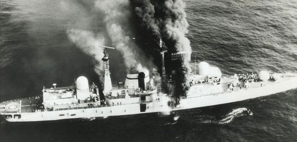 Το πληγωμένο HMS Sheffield. Aεροσκάφη τύπου Super Etendard έπληξαν, με βλήματα Exocet, και βύθισαν το βρετανικό αντιτορπιλικό HMS Sheffield.