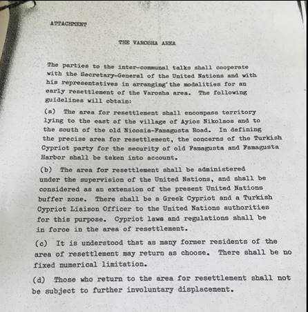 «Α) Το Βαρώσι θα απο – στρατικοποιηθεί και θα κρατηθεί υπό τουρκική διοίκηση για 5 χρόνια μέχρι την τελική συνολική λύση.