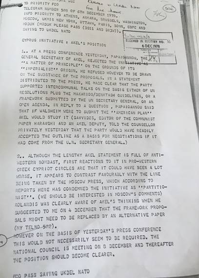 Στις 6.12.1978 η Υπ. Αρμοστεία έγραψε ότι την προηγούμενη, ο τότε γενικός γραμματέας του ΑΚΕΛ, μ. Εζεκίας Παπαϊωάννου, απέρριψε την βρετανο-αμερικανο-καναδική πρωτοβουλία για «λόγους αρχής» (“ a matter of principle”) στη βάση της «ιμπεριαλιστικής» του καταβολής και ότι ήταν «ιμπεριαλιστικής» προέλευσης και αρνήθηκε να συζητήσει την ουσία των προτάσεων. Σε ανακοίνωση που κυκλοφόρησε, το έκανε ξεκάθαρο ( ο Ε.Π) ότι το κόμμα υποστήριζε τις ενδο-κοινοτικές συνομιλίες στη βάση είτε ενός ψηφίσματος του ΟΗΕ συν των κατευθυντηρίων γραμμών Μακαρίου/Ντενκτάς είτε ενός περιγράμματος που θα κατέθετε ο ΓΓ του ΟΗΕ ή μια ανοικτή ατζέντα. Απαντώντας σε ερώτηση ο Παπαϊωάννου είπε ότι «αν ο Βάλτχαιμ ερχόταν να προτείνει το «Αμερικανικό σχέδιο» το ΑΚΕΛ θα το μελετούσε…».