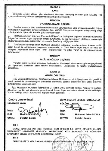 Σύμφωνα με το CNN Turkey στο άρθρο 2 της συμφωνίας γίνεται αναφορά στη σημασία που έχουν αυτοί οι χάρτες και επισημαίνεται ότι αποτελούν «αναπόσπαστο μέρος» της συμφωνίας. Σύμφωνα με το άρθρο 3, αφού περάσει η συμφωνία από την τουρκική εθνοσυνέλευση θα ανακοινωθεί στα Ηνωμένα Έθνη. Οι ίδιες πηγές αναφέρουν ότι σύμφωνα με το άρθρο 4 της συμφωνίας, σε περίπτωση που παρατηρηθεί ασυμφωνία τότε θα επιλυθεί δια της συνεργασίας και της διπλωματικής οδού. Στη συμφωνία αναφέρεται επίσης ότι στην περίπτωση που το ένα εκ των δύο κρατών ξεκινήσει συνομιλίες με άλλο κράτος για τη θαλάσσια δικαιοδοσία τότε θα δώσει ενημέρωση στην άλλη πλευρά (η Τουρκία στην Λιβύη ή η Λιβύη στην Τουρκία) πριν την τελική συμφωνία.