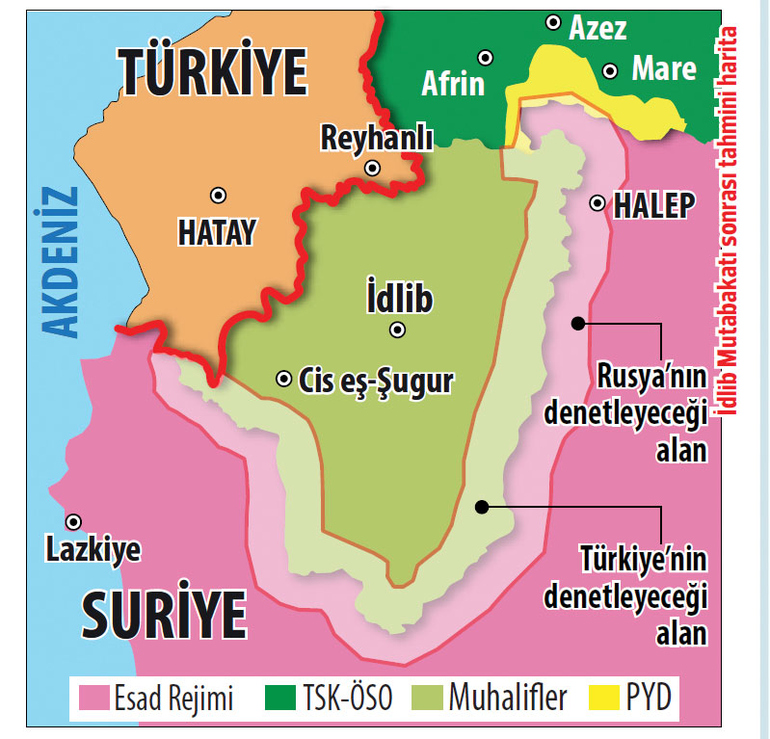 Ο χάρτης δείχνεις τις ζώνες αποκλιμάκωσης και αφοπλισμού, που συμφωνήθηκαν στο Σότσι. Με ροζ χρώμα η ζώνη υπό τον έλεγχο της Ρωσία, με λαχανί, η ζώνη υπό τον έλεγχο της Τουρκίας και με πράσινο η περιοχή που θα ήταν υπό τον έλεγχο της αντιπολίτευσης, με τους ακραίους ισλαμιστές αφοπλισμένους από τα βαριά όπλα. Η Τουρκία δεν τήρησε τη Συμφωνία του Σότσι, όπως την κατηγορεί η Ρωσία.