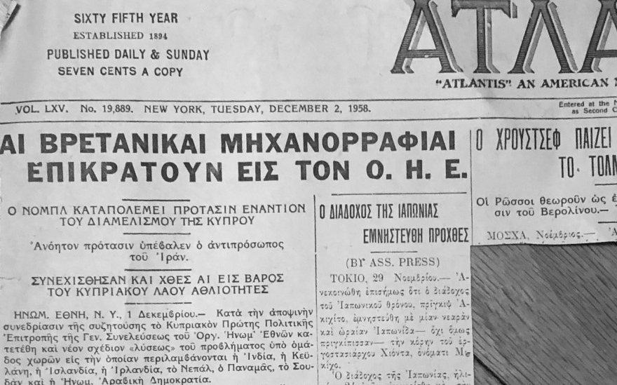 Το πρωτοσέλιδο της ελληνοαμερικανικής ημερήσιας εφημερίδας «Ατλαντίς», στις 2 Δεκεμβρίου 1958, που αναφερόταν στις βρετανικές μηχανορραφίες κατά τη συζήτηση του Κυπριακού στα Ηνωμένα Έθνη.