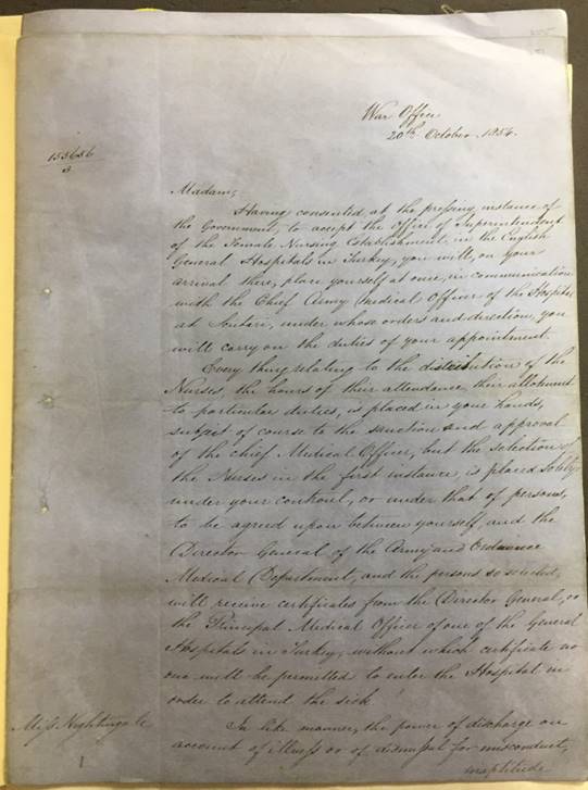 Καθώς έφθαναν στο Λονδίνο πληροφορίες για την άθλια κατάσταση των νοσοκομείων και την έλλειψη νοσηλευτικού προσωπικού στην Ανατολή, ο τότε Υπουργός Πολέμου Sidney Herbert, διόρισε την 34χρονη τότε Florence Nightingale να πάει στο στρατιωτικό νοσοκομείο στο Scutari και να πάρει μαζί της μια ομάδα από 38 γυναίκες, περιλαμβανομένων και επαγγελματιών νοσοκόμων, κυρίες της υψηλής κοινωνίες και γυναίκες από θρησκευτικές ομάδες. Αντίγραφο της επιστολής του Υπουργού Πολέμου Sidney Herbert, περιγράφοντας το κάθε τι σχετικά με τα καθήκοντα και εξουσίες της Nightingale, όπως τα καθήκοντα των νοσοκόμων, τις ώρες εργασίας τους, όλα όσα είχαν αφεθεί στα χέρια της, σώζεται σε φάκελο στο Εθνικό Αρχείο (κατάλογος WO 43).Με την υποστήριξη λοιπόν του Γραφείου Πολέμου η Nightingale έφυγε από την Αγγλία στις 21 Οκτωβρίου 1854 και ταξίδεψε στην εμπόλεμη ζώνη μέσω Κωνσταντινούπολης, όπως περιγράφουν τα αρχεία στο Εθνικό Αρχείο της Βρετανίας στο Λονδίνο. Η κυβέρνηση πλήρωσε όλα τα έξοδα ταξιδιού της ομάδας της Nightingale…