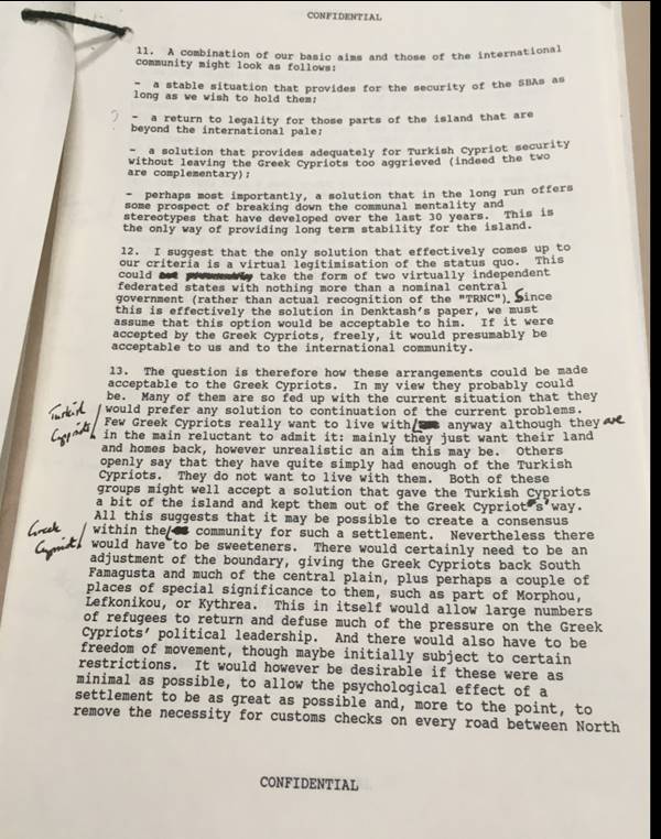 «Στις 9 Αυγούστου 1990 ο αξιωματούχος στη βρετανική Υπ. Αρμοστεία στη Λευκωσία David G. H. Frost έστειλε στο Λονδίνο μια μακροσκελή έκθεση με εισηγήσεις/προτάσεις για λύση του Κυπριακού. Έβρισκε ότι η μόνη αποτελεσματική λύση που ανταποκρινόταν στα βρετανικά κριτήρια ήταν μια εικονική νομιμοποίηση του στάτους κβο που μπορούσε να πάρει τη μορφή δύο σχεδόν ανεξαρτήτων ομόσπονδων κρατών με μία τίποτα περισσότερο από κατ’ όνομα κεντρική κυβέρνηση (παρά μια πραγματική αναγνώριση της «ΤΔΒΚ»). «Αυτή η πολιτική συνοψίζεται στο να τεθούν περισσότερες πιέσεις πάνω στους Ελληνοκύπριους να δεχθούν μια λύση που θεωρούν απαράδεκτη. Αυτό θα ενοχλήσει βραχυπρόθεσμα τις σχέσεις μας μαζί τους, γι’ αυτό θα χρειαστούμε διεθνή κάλυψη για να το καταφέρουμε. Αυτό θα γίνει είτε με ανανέωση της πρωτοβουλίας του ΓΓ του ΟΗΕ είτε με το να τον ενθαρρύνουμε να απομακρυνθεί για μια πρωτοβουλία από την Ευρωπαϊκή Κοινότητα και τις ΗΠΑ. Ίσως να χρειαζόμαστε να ρισκάρουμε βραχυπρόθεσμα πολιτικό κόστος για χάρη μακροπρόθεσμης σταθερότητας…», έγραψε ο κ. Frost (Φροστ).
