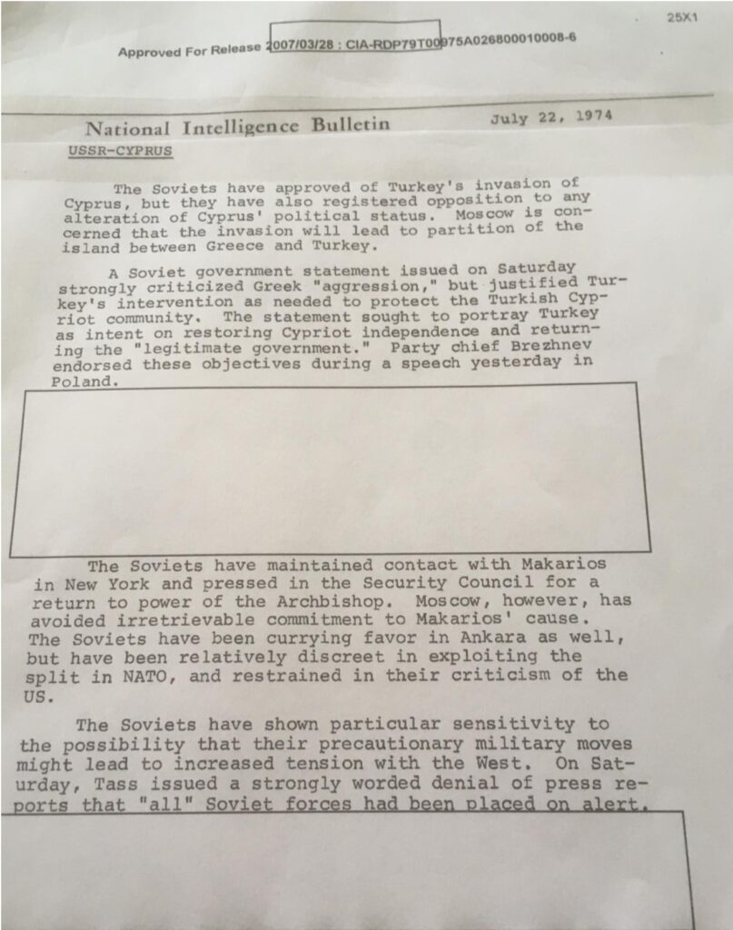 Αποδεσμευμένο έγγραφο της Αμερικανικής Υπηρεσίας Πληροφοριών (CIA) ημερ. 22 Ιουλίου 1974 (National Intelligence Bulletin) γράφει: