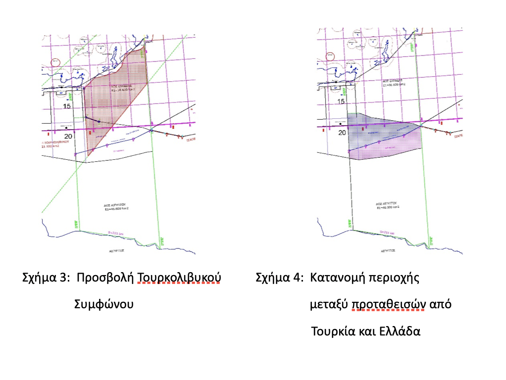 Φάνηκε ότι η Αίγυπτος δεν προτίμησε την προσφερθείσα από το Τουρκολιβυκό σύμφωνο οριογραμμή (προέκταση της ΑΒ), η οποία προεκτεινόταν Νοτιοανατολικά και μέσα στην περιοχή που οριοθετήθηκε και της έδινε ένα επιπλέον εμβαδόν περίπου Ε=9.900 χλμ2. Παράλληλα όμως δεν ακολουθήθηκε και η προτεινόμενη γραμμή ΑΟΖ από την Ελλάδα, αλλά μετακινήθηκε Βόρεια εις βάρος μας κατά 7.400 χλμ2. (Σχήμα 4)
