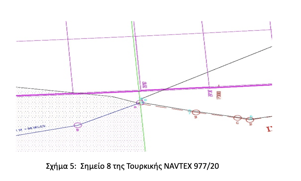 Ο Ανατολικός “οριοθετικός” μεσημβρινός βρίσκεται στις 27° 59´ 02”, δηλαδή 58 δευτερόλεπτα τόξου πριν τον μεσημβρινό των 28 μοιρών. Δηλαδή απέχει από αυτόν μια απόσταση περίπου 1450 μέτρων (58χ30χ συν34°= 1442) Δυτικά από την γραμμή που ορίζουν τα σημεία1 και 8 (που ευρίσκονται επι του μεσημβρινού των 28 μοιρών και αποτελούν το Δυτικό όριο της NAVTEX 977/20 της Τουρκίας, η οποία είχε προαναγγελθεί σαν περιοχή ερευνών του ORUC REIS τον Ιούνιο αλλά δεν ενεργοποιήθηκε). Άξιο σημείωσης είναι το γεγονός, ότι η Αίγυπτος διαμαρτυρήθηκε γι’ αυτήν τη NAVTEX της Τουρκίας, λέγοντας ότι το σημείο 8 ανήκει στην δική της ΑΟΖ και όπως φαίνεται από τον συνημμένο χάρτη, βρίσκεται κατά προσέγγιση στην προέκταση της γραμμής A,B,C,D,E Ανατολικά (Σχήμα 5), προδικάζοντας με τον τρόπο αυτόν τις μελλοντικές απαιτήσεις της στην περιοχή.