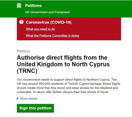 Αξίζει να σημειωθεί ότι προς το τέλος του Ιουλίου 2020 ο κ. Hasan Ozkoc (Τουρκοκύπριος Βρετανίας) ξεκίνησε μια εκστρατεία για υπογραφές, αγγλιστί petition, (αυτό είναι δικαίωμα κάθε βρετανού πολίτη) για να πιέσει την βρετανική κυβέρνηση να δεχθεί το αίτημα για απευθείας πτήσεις από τα κατεχόμενα στο Ηνωμένο Βασίλειο. Το σύστημα λειτουργεί ως εξής. Όταν οι υπογραφές φθάσουν τις 10,000 η κυβέρνηση είναι υποχρεωμένη να απαντήσει. Όταν οι υπογραφές φθάσουν τις 100,000 το θέμα μπορεί να μελετηθεί για συζήτηση στη Βουλή των Κοινοτήτων. Το petition διαρκεί έξι μήνες η τελευταία ημερομηνία για αυτή την εκστρατεία είναι η 27 Ιανουαρίου 2021.