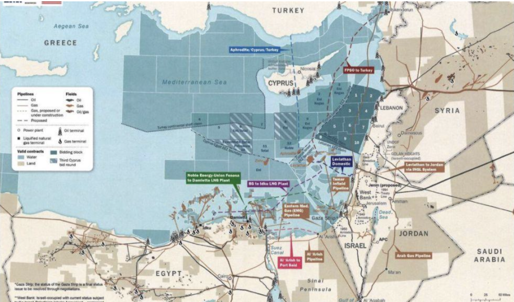 Στον χάρτη αποτυπώνονται οι δυνητικές διαδρομές εξαγωγής φυσικού αερίου στην περιοχή που προτείνονται από τις ΗΠΑ ενώ καθορίζονται χωρίς περιστροφές τα όρια των ΑΟΖ Κύπρου, Τουρκίας, καθώς και οι οριοθετήσεις των θαλλάσιων οικοπέδων στην περιοχή. Θα μπορούσε να εικάσει κανείς οτι όλα αυτά δεν είναι τίποτα περισσότερα παρά ασκήσεις επί χάρτου και ουδεμία σχέση έχουν με την πραγματικότητα.