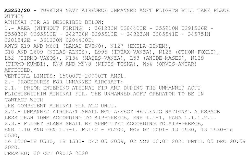 Η Τουρκία ζήτησε για πρώτη φορά από την Αθήνα να εκδώσει διεθνή αγγελία για πτήση τουρκικών στρατιωτικών μη επανδρωμένων αεροσκαφών (UAV) στην περιοχή της Αν. Μεσογείου . H κυβέρνηση/ΥΠΕΞ/ΥΠΑ/ΥΕΘΑ εξέδωσε τη διεθνή αγγελία (ΝΟΤΑΜ) Α 3250 στις 30 Οκτ. 2020 με ισχύ μέχρι τις 5 Δεκεμβρίου 2020. Το MILITAIRE δημοσιεύει τη NOTAM A3250/2020