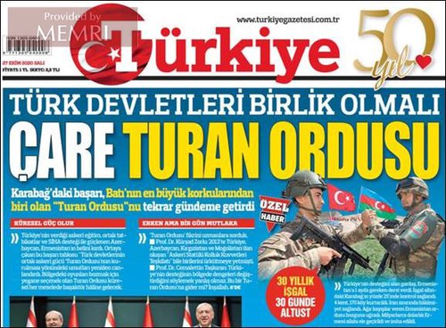 Άρθρο του Καθηγητή Οικονομικών Kürşad Zorlu του Πανεπιστημίου Hacı Bayram Veli της Άγκυρας στην εφημερίδα «Türkiye» (27/10/2020), υπό τον τίτλο «Τα τουρκικά κράτη πρέπει να ενωθούν: Ο Στρατός του Τουράν είναι η ελπίδα», αναφέρει: «Η επιτυχία στο Καραμπάχ έφερε και πάλι στην ατζέντα έναν από τους μεγαλύτερους φόβους της Δύσης: Τον Στρατό του Τουράν. Το Αζερμπαϊτζάν, το οποίο έγινε ισχυρότερο με τη στρατιωτική εκπαίδευση, τις κοινές ασκήσεις και τα εξοπλισμένα drones που παρείχε η Τουρκία, έσπασε τη ράχη της Αρμενίας. Αυτή η εικόνα επιτυχίας που εμφανίστηκε έφερε και πάλι στη ζωή τους πόθους σχετικά με έναν Στρατό του Τουράν, ο οποίος θα είναι η κοινή στρατιωτική δύναμη των τουρκικών κρατών. Ο Τουρανικός Στρατός, ο οποίος θα είναι μια μοναδική επιλογή για διακοπή των σχεδίων στην περιοχή, θα καταστεί ένας ηγετικός παράγοντας σε κάθε ζήτημα». Αναφέρει επίσης πως «θα γίνει παγκόσμια δύναμη – είναι νωρίς, αλλά οπωσδήποτε μια μέρα».