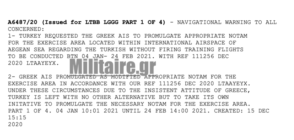 Η Τουρκία με το ΤΕLEX 111256 ζήτησε από την Ελλάδα στις 11 Δεκεμβρίου 2020 να εκδώσει διεθνή αγγελία για εκτέλεση ΑΣΚΗΣΗΣ-ΕΚΠΑΙΔΕΥΣΗΣ ΠΤΗΣΕΩΝ χωρίς πυρά σε πέντε περιοχές στον ΔΙΕΘΝΗ ΕΝΑΕΡΙΟ ΧΩΡΟ ΤΟΥ ΑΙΓΑΊΟΥ από 4 Ιανουαρίου ως τις 24 Φεβρουαρίου 2021.