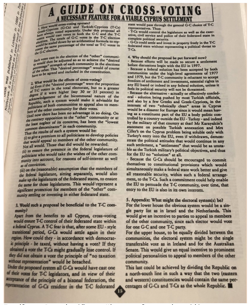 «…Εκτός από τα ωφελήματα για όλη την Κύπρο, η διασταυρούμενη ψήφος θα εξασφαλίσει στους Τουρκοκυπρίους τον έλεγχο του ομόσπονδου κράτους τους σε μια ομόσπονδη Κύπρο… Αυτό μπορεί να επιτευχθεί μοιράζοντας τη Δημοκρατία με μια βόρεια-νότια γραμμή με τέτοιο τρόπο, που αμφότερες… οι περιφέρειες θα έχουν το ίδιο ποσοστό Ελληνοκυπρίων και Τουρκοκυπρίων όπως όλη η δημοκρατία…»