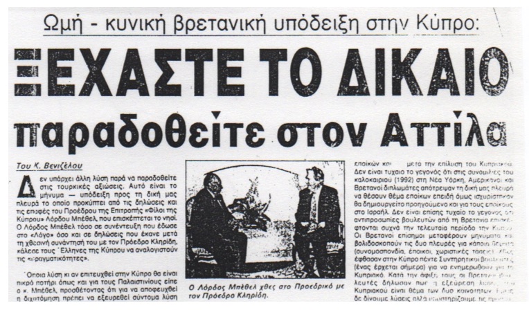 Τον Σεπτέμβριο του 1993 ο τότε πρόεδρος της περιβόητης ομάδας «Φίλοι της Κύπρου» Βρετανός Nicholas Bethell καθώς στην Κύπρο (πέθανε το 2007, πράκτορας και των μυστικών υπηρεσιών σε σχέση με τη Ρωσία) ωμά και κυνικά υπέδειξε να δεχθούμε τη λύση που απαιτεί η Τουρκία και εξίσωσε τους έποικους με τους Ελληνοκύπριους πρόσφυγες, αμφότερα τα θέματα ανθρωπιστικά είπε, μετά τη λύση θα μπορούν να προσφερθούν αποζημιώσεις σε εποίκους που θέλουν να φύγουν. («Σημερινή» Κ. Βενιζέλου 28.9.1993.)