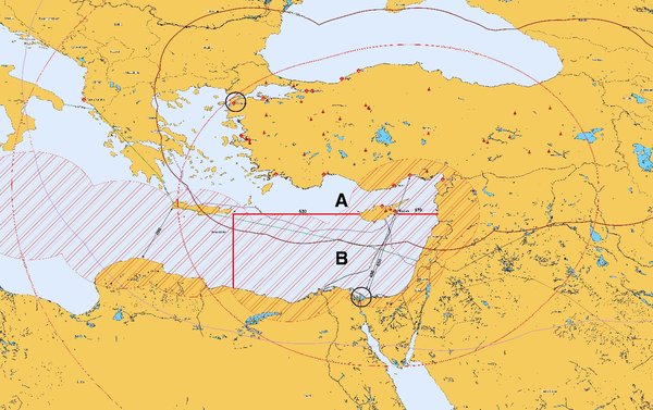 Ο χάρτης αυτός αποτυπώνει πώς η Τουρκία αποκόπτει την ανατολική Μεσόγειο από την υπόλοιπη Ευρώπη και την Ελλάδα. Το σημείο Α είναι η υλοποίηση της τουρκικής λίμνης, όπως τη γνωρίζαμε ώς σήμερα, από τη Μαρμαρίδα ώς την Αλεξανδρέττα. Τώρα, έχει αρχίσει το σχέδιο Β. Εκτείνεται η τουρκική λίμνη και στα νότια. Για να ελέγξει η Τουρκία με ναυτικές Βάσεις, μεταξύ των οποίων και αυτή στο Μπογάζι, τις θαλάσσιες και εναέριες οδούς από και προς το Σουέζ, θέτοντας μέσω της πτώσης της Κύπρου την Ευρώπη υπό τη δική της εξάρτηση. Ο μαυροκόκκινος εξωτερικός κύκλος αποτυπώνει το βεληνεκές των πυραύλων «Μπόρα» που φτάνουν τα 280 χιλιόμετρα και ο κόκκινος εκείνο των πύραυλοι «Τ-80», τους οποίους η Άγκυρα έχει υπό σχεδιασμό για παραγωγή με βεληνεκές 800 χιλιόμετρα. Οι τουρκικές Βάσεις λειτουργούν ως πολλαπλά σημεία εξόρμησης σε συνθήκες επιθετικού και αμυντικού αγώνα. Με τη στρατηγική αυτή, η Άγκυρα θέλει να βάλει τέλος στον EastMed και να κλέψει τον ρόλο της Κύπρου στην ΕΕ, ελέγχοντας το φυσικό αέριο μέσω αγωγού προς τα δικά της παράλια, ειδικώς μέσω της ομοσπονδίας.