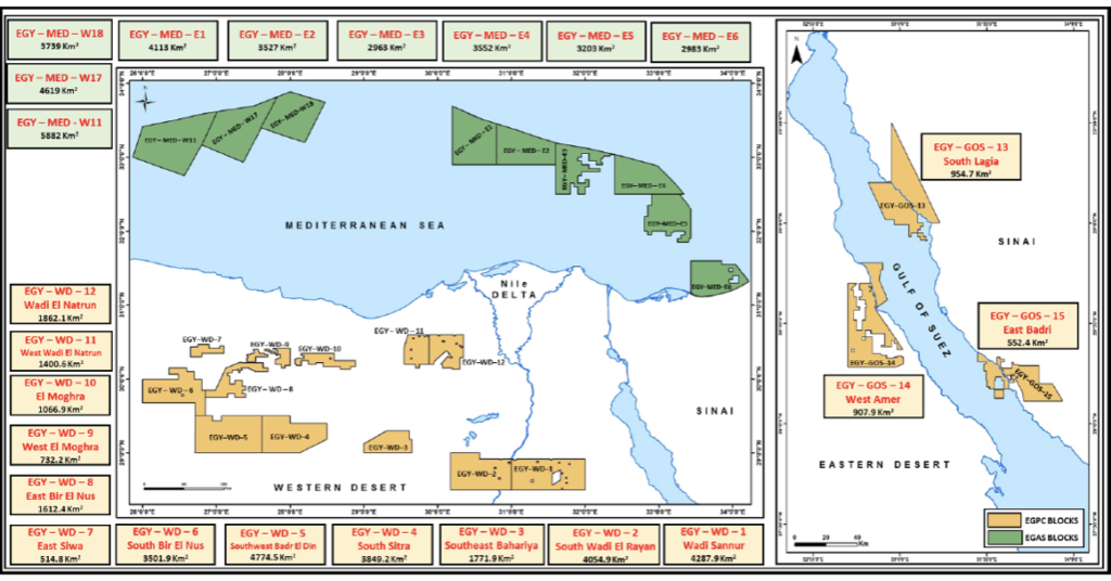 Oι κρατικές εταιρείες Πετρελαίου (Egyptian General Petroleum Corporation – EGPC) και Φυσικού Αερίου (Εgyptian Natural Gas Holding Company – EGAS) της Αιγύπτου, προχώρησαν στην προκήρυξη διεθνούς διαγωνισμού για την εξερεύνηση και εκμετάλλευση υδρογοναθράκων σε 24 συνολικά «οικόπεδα» (χερσαία και βυθοτεμάχια), στον Κόλπο του Σουέζ, στη Δυτική Σαχάρα και την Μεσόγειο.