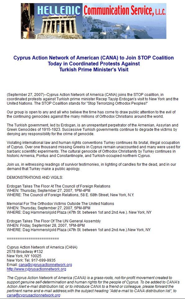 Ενάντια στην επίσκεψη του Τούρκου Πρωθυπουργού στις ΗΠΑ τον Σεπτέμβριο του 2007.