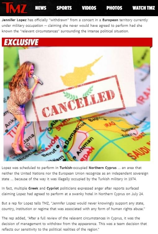 «Η ΑΜΕΡΙΚΑΝΙΔΑ καλλιτέχνιδα Τζένιφερ Λοπέζ τελικά ανέκρουσε πρύμναν. Ακύρωσε τη μετάβασή της στο ψευδοκράτος. Ήταν το αποτέλεσμα σκληρής δουλειάς χιλιάδων Ελλήνων, διά του διαδικτύου… Η εξαγγελία της μετάβασης στο ψευδοκράτος και καλλιτεχνικής εκδήλωσης της Λόπεζ αποτέλεσε αφόρητη πρόκληση προς κάθε Έλληνα. Έτσι επέσυρε μια πρωτοφανή κινητοποίηση, που ξεκίνησε στις 30 Ιουνίου με πρωτοβουλία του Cyprus Action Network of America (CANA) και ως πυρκαγιά εξαπλώθηκε στο διαδίκτυο. Μέσα Ενημέρωσης σε πολλές χώρες αναφέρθηκαν στη Λόπεζ και δι’ αυτής, στη συνεχιζόμενη κατοχή της Κύπρου από την Τουρκία, που διεκδικεί να ενταχθεί στην Ε.Ε… Το πρώτο ρεπορτάζ για τις οργισμένες αντιδράσεις των Ελλήνων δημοσιεύτηκε στις 5 Ιουλίου, στη βρετανική «Γκάρντιαν», με την υπογραφή της Χέλενα Σμίθ. Το δημοσίευμα ακολούθησε πλειάδα αναφορών στο διεθνή Τύπο -από τις ΗΠΑ μέχρι τη Βρετανία, την Αυστραλία, τη Γαλλία, την Ελλάδα, την Ολλανδία, την Ισπανία, την Πολωνία, τον Καναδά, το Ισραήλ, τη Νότια Αφρική, τη Μαλαισία- ο οποίος πρόβαλε και τη συνεχιζόμενη τουρκική κατοχή της Κύπρου και επισήμανε ότι η Λόπεζ βρέθηκε στο επίκεντρο ενός «πολιτικού ναρκοπεδίου».