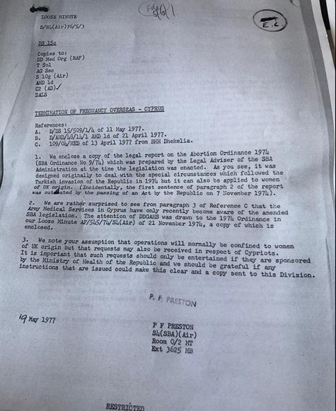 Οι εκτρώσεις είχαν ξεκινήσει στο Νοσοκομείο Πριγκίπισσα Μαίρη (Princess Mary) στο Ακρωτήρι, στις 22 Οκτωβρίου. Έτσι τροποποιήθηκε ο νόμος αναλόγως στις 21 Οκτωβρίου 1974…» («Σημερινή», 27 Δεκεμβρίου 2006).